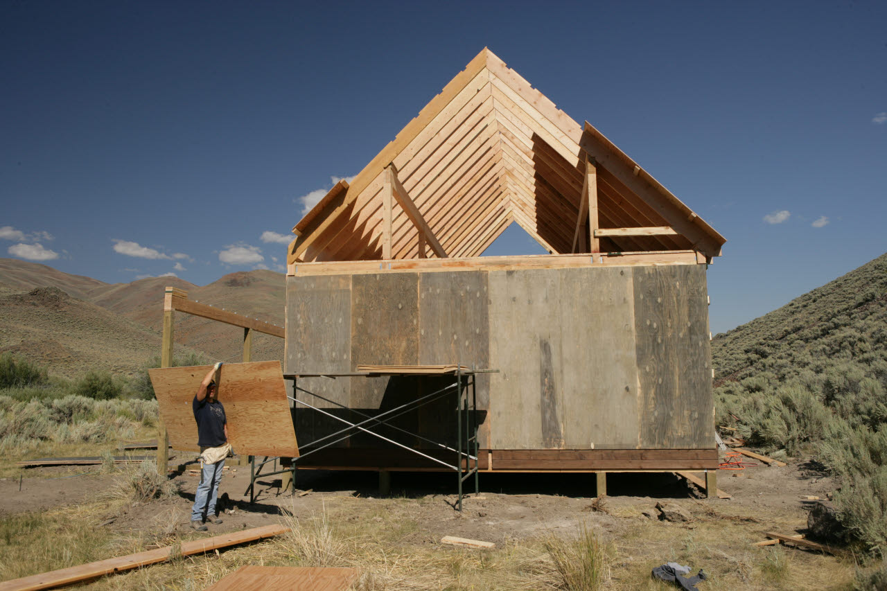 View: MedRes / HiRes | Putting on 'weathered' siding Seams will be covered by cedar battens.