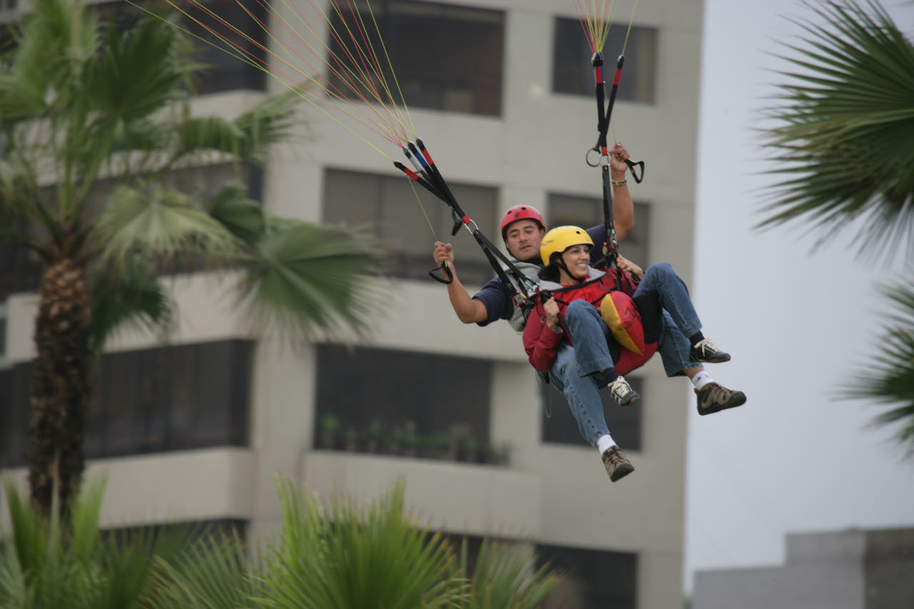 View: MedRes / HiRes | Paragliding in Miraflores, Lima, Peru Amynah is flying with Marco Mercado of Tandem Flights Paseos en Parapente (www.tandemperu.com).
