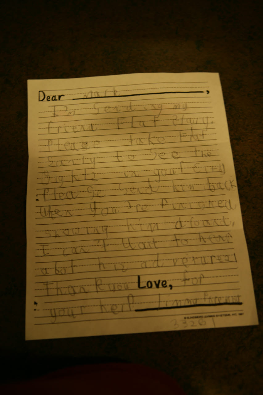 View: MedRes / HiRes | The letter Jimmy included with Stanley The letter that arrive with Flat Stanley explained he was flattened in an accident. But now, he can travel the world in the mail. Now he always travels first class - for the price of a US postage stamp.