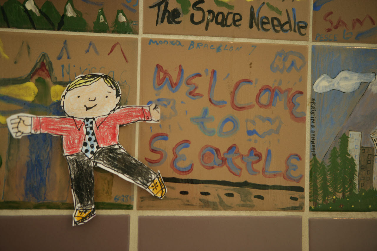 Flat Stanley stopped to look at the tiles in the Monorail station. They were painted by kids with pictures of things found in Seattle, including rain clouds and whales.