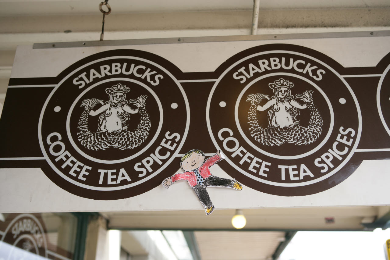 View: MedRes / HiRes | The First Starbucks Surely you've heard of Starbuck coffee. Well this is Flat Stanley at the first Starbucks. Starbucks started in Seattle and still has their headquarters here.