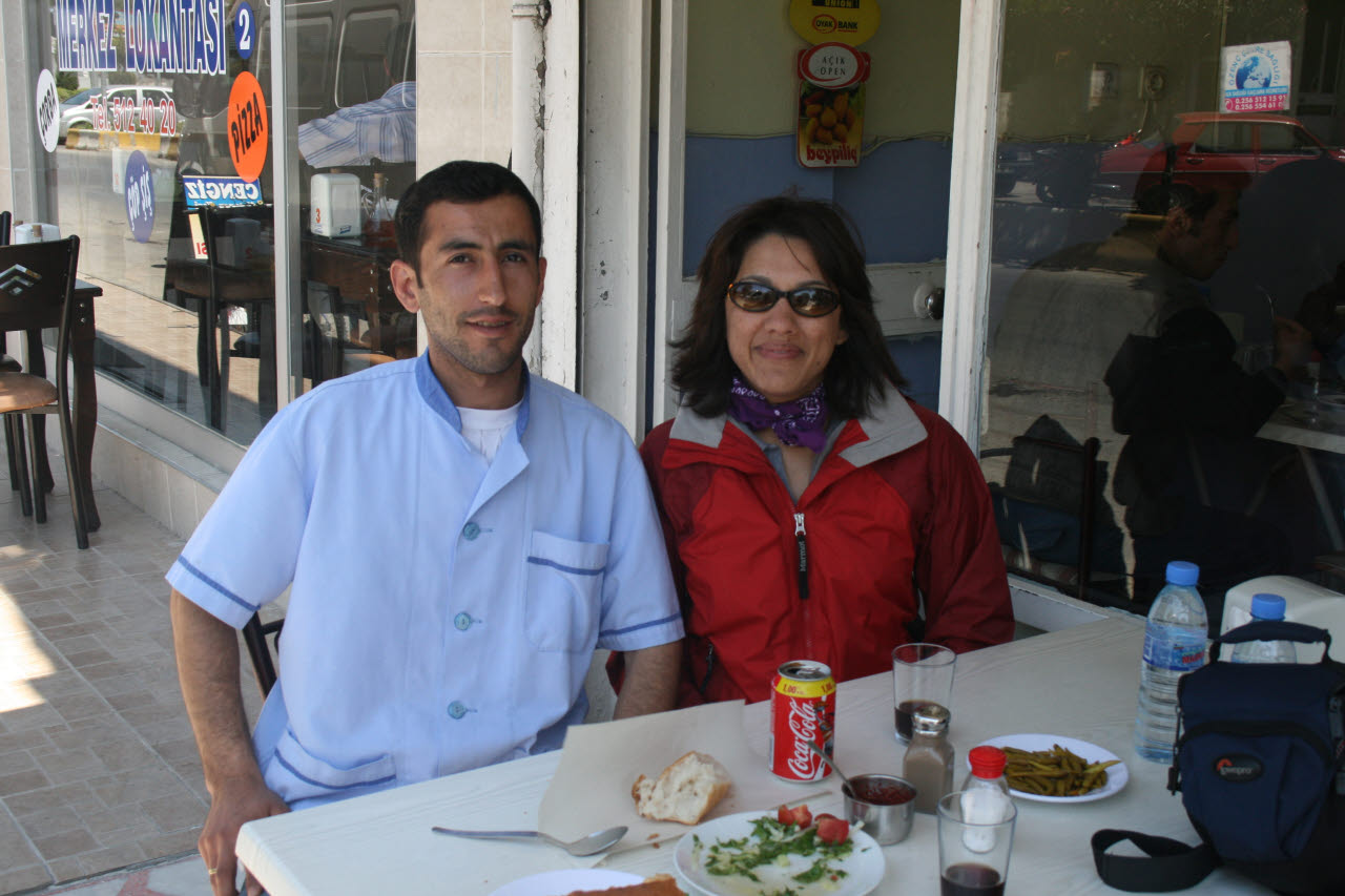 View: MedRes / HiRes | Amynah with waiter at lunch in Soke, Turkey