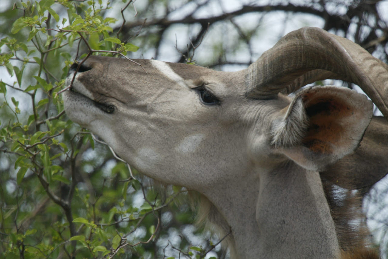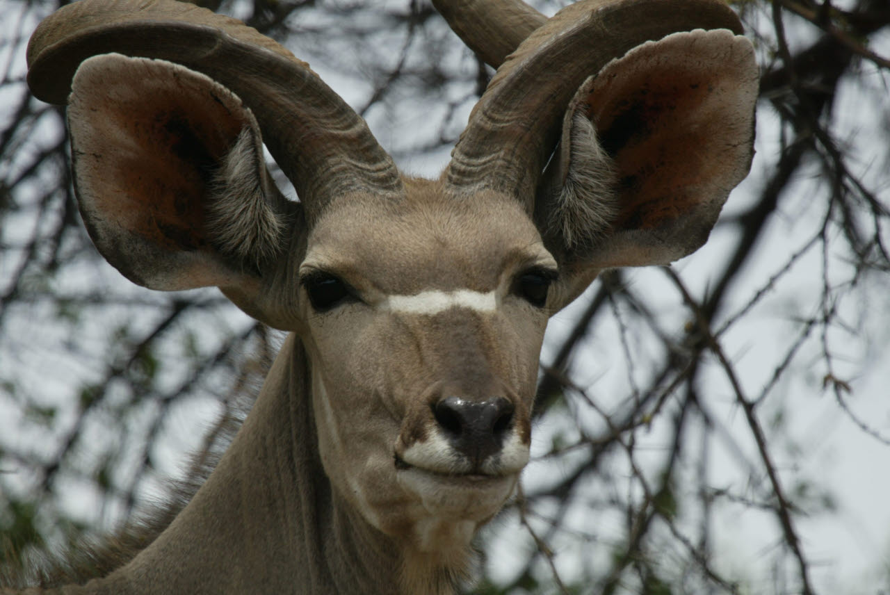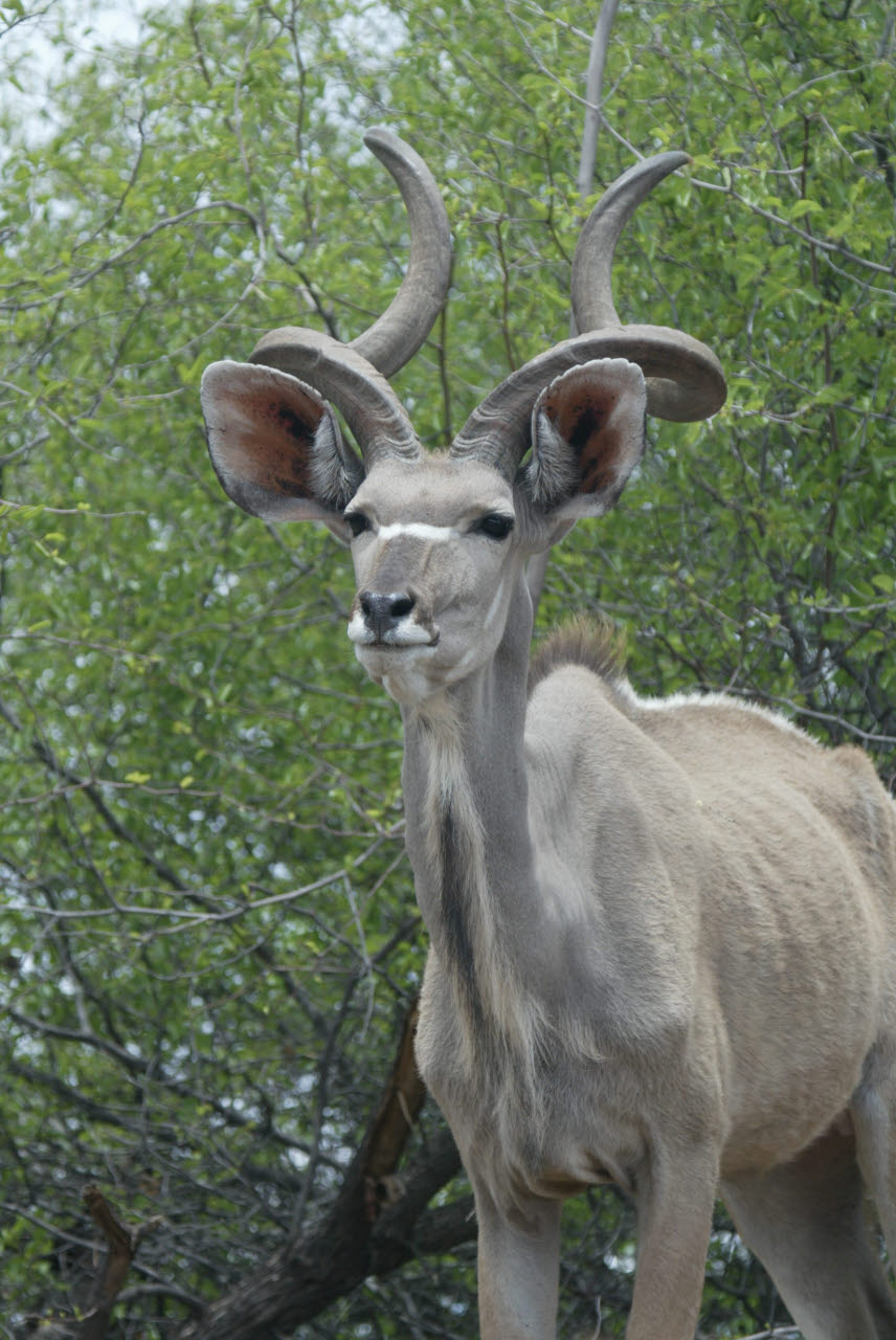 The Greater Kudu is a very tall, narrow-bodied antelope, with a small head and huge cupped ears. Adult male Kudu are blue-gray, darkening with age. Female and young Kudu are tan-colored. Kudu are nearly pure browsers that feed on a variety of foliage, herbs, vines, tubers, succulents, flowers and fallen fruit. Greater Kudus disperse widely during rains and spend the dry season along rivers and bases of hills where evergreen growth persists.