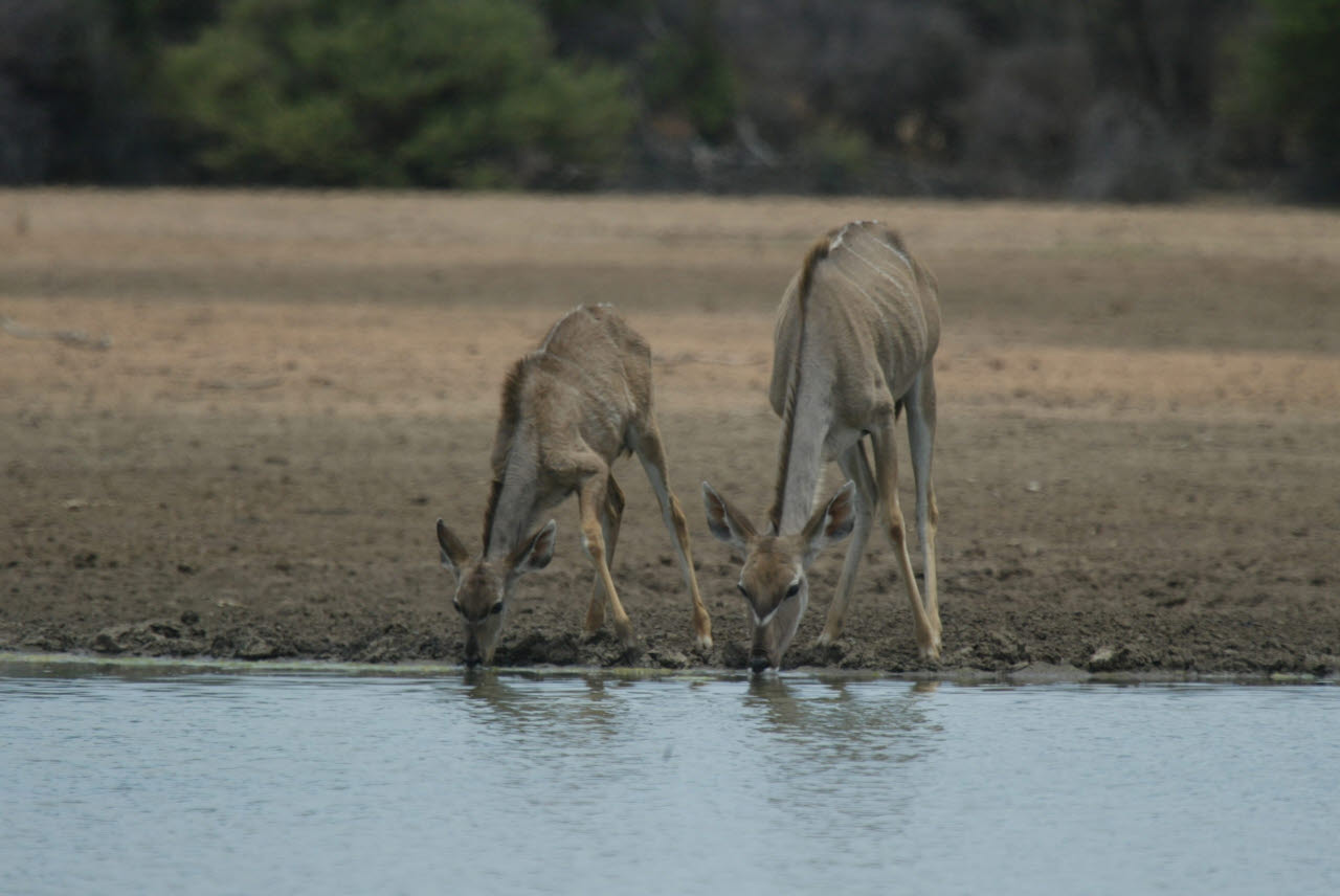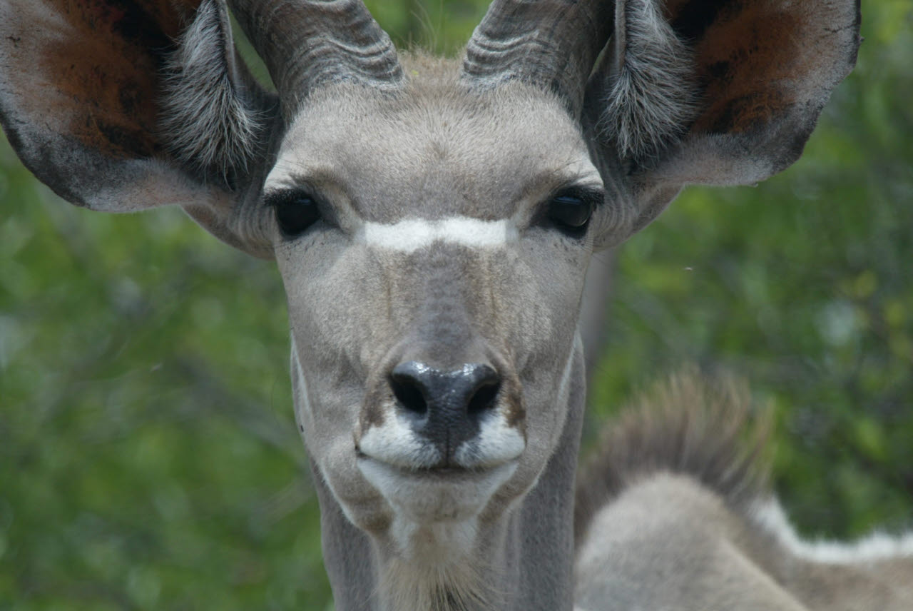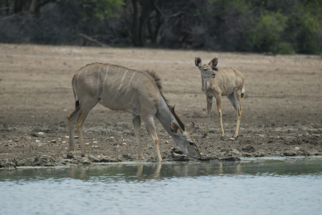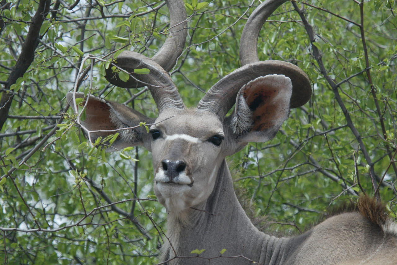 The Greater Kudu is a very tall, narrow-bodied antelope, with a small head and huge cupped ears. Adult male Kudu are blue-gray, darkening with age. Female and young Kudu are tan-colored. Kudu are nearly pure browsers that feed on a variety of foliage, herbs, vines, tubers, succulents, flowers and fallen fruit. Greater Kudus disperse widely during rains and spend the dry season along rivers and bases of hills where evergreen growth persists.