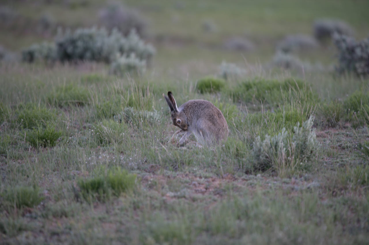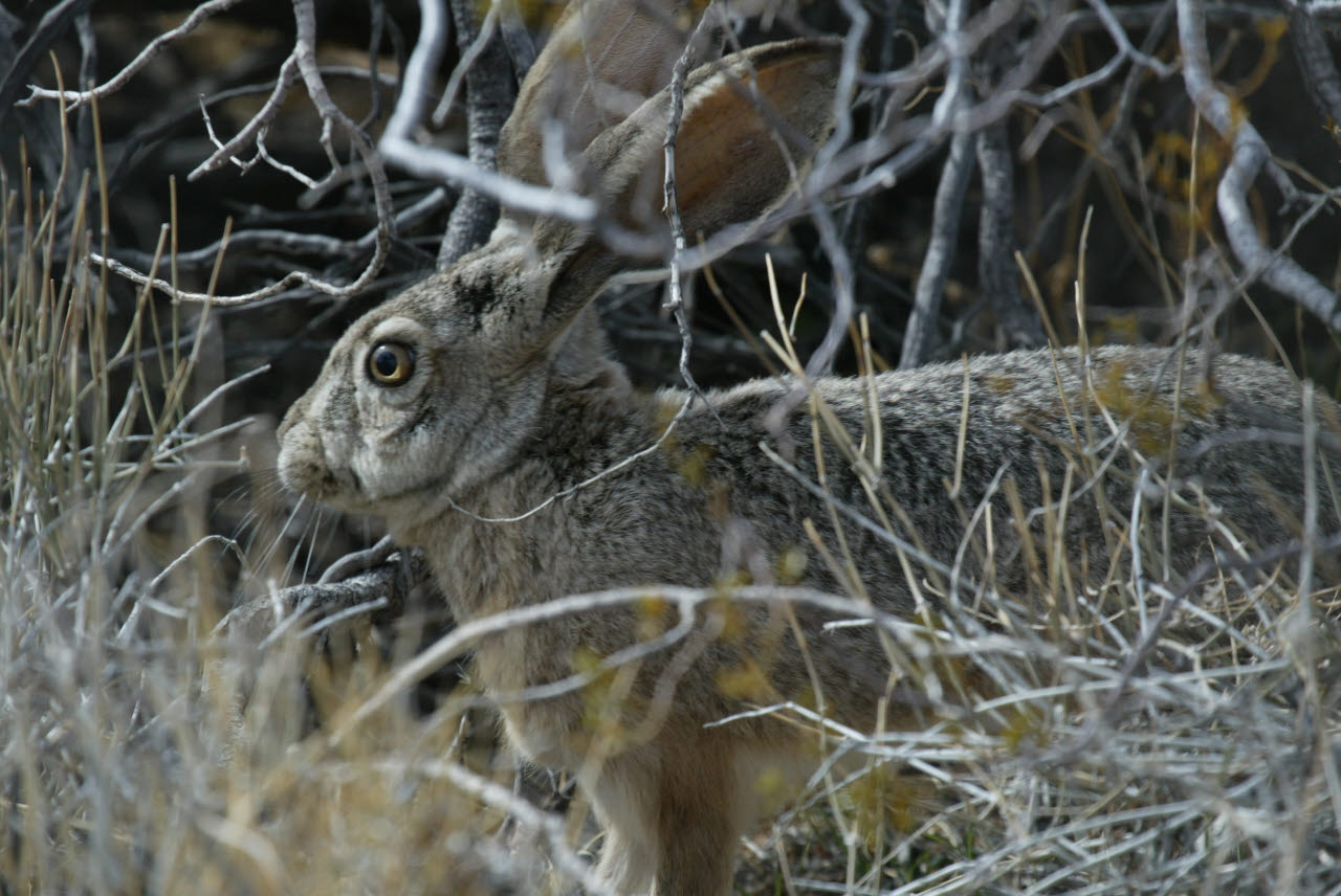Hares and rabbits are small, stocky, short-tailed mammals with thick usually soft fur. There family has 53 species worldwide. Hares and rabbits have long hind legs for sprinting, and long mobile ears and large eyes for detecting nighttime predators. Hares rely on cryptic coloration as they lie up in shallow forms in grass and under bushes. When pursued, hares can run 30 mph or faster. Rabbits, in contrast, bolt into burrows or thickets.