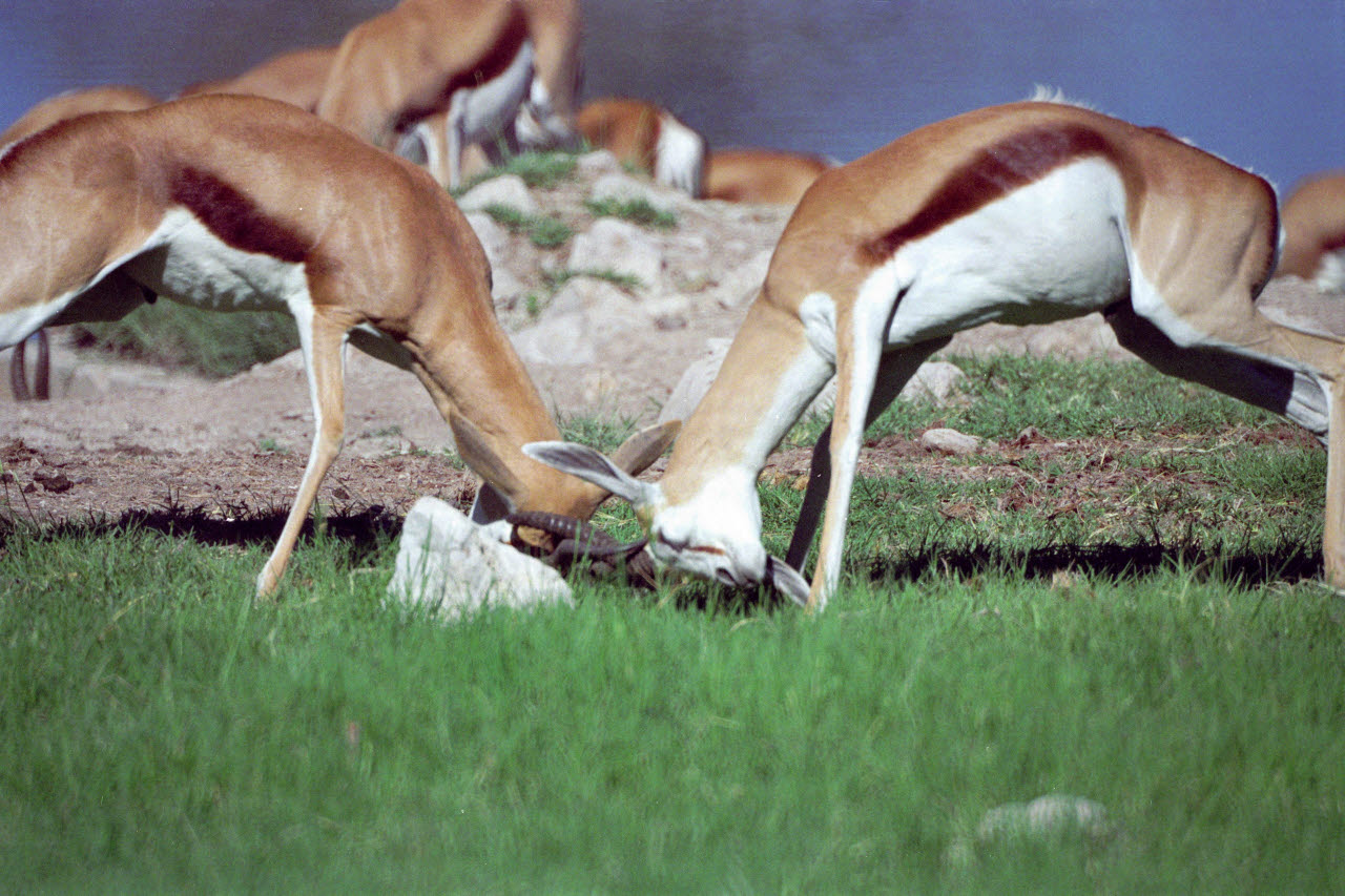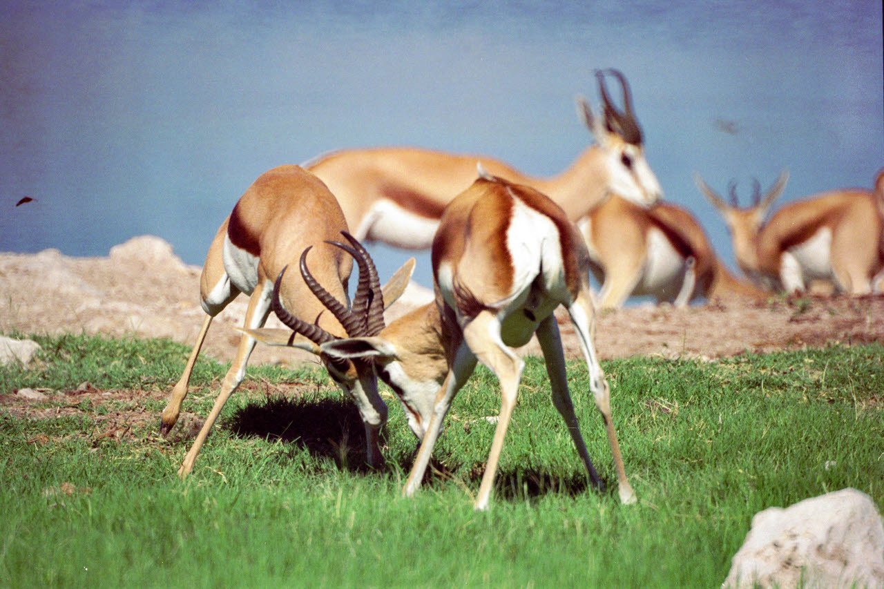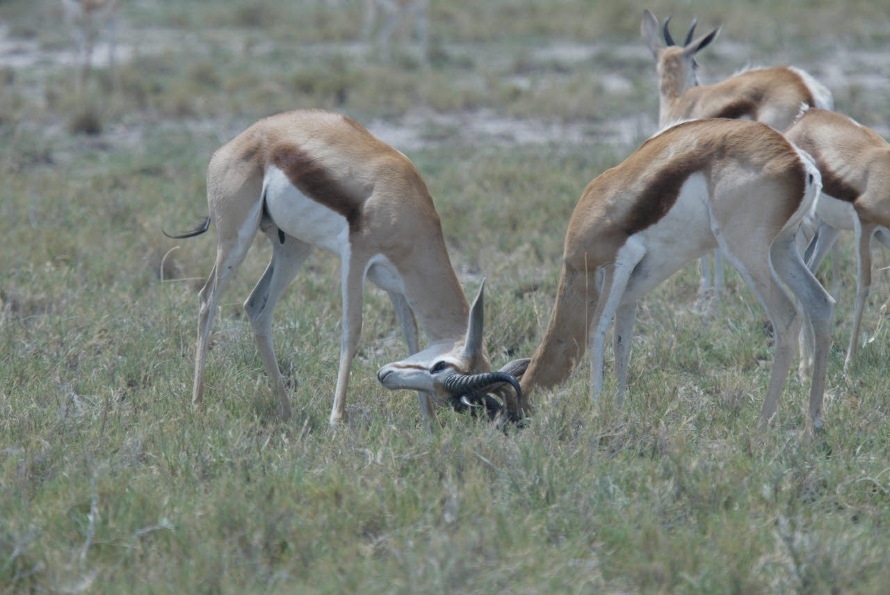 The Springbok's name is derived from its "pronking" display, which is the most spectacular form of stotting (high bounding) of any antelope. This sign of excitement is elicited by various stimuli, especially predators. In a complete performance, a Springbok makes stiff-legged jumps to heights of 10 feet with its head down, back bowed, and spinal crest fully erected. Springbok number in the tens of thousands in the Etosha National Park. Springbok have strongly ridged horns; bowed out with tips hooked inward like a stethoscope.