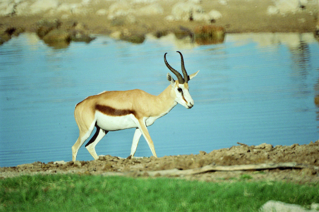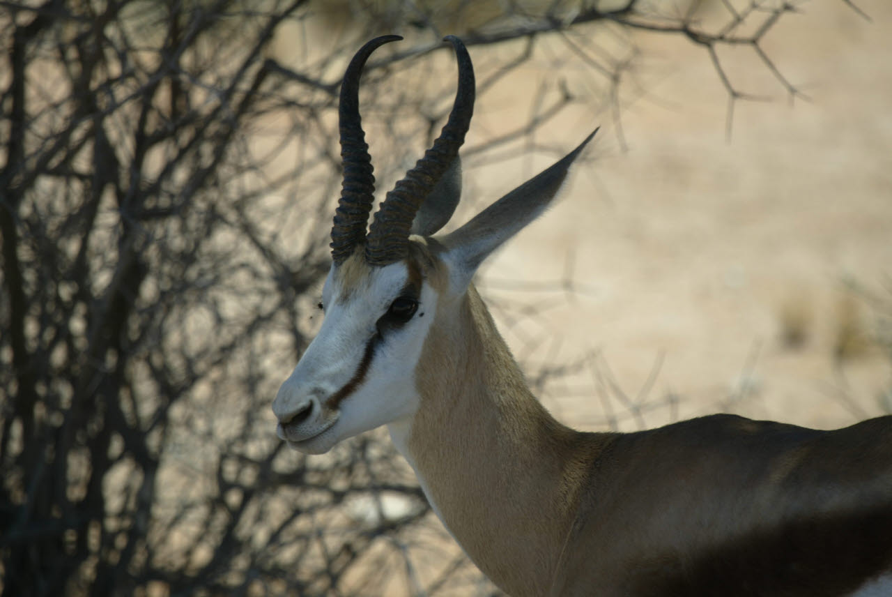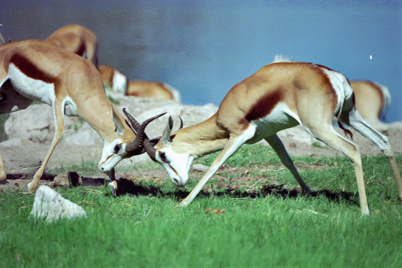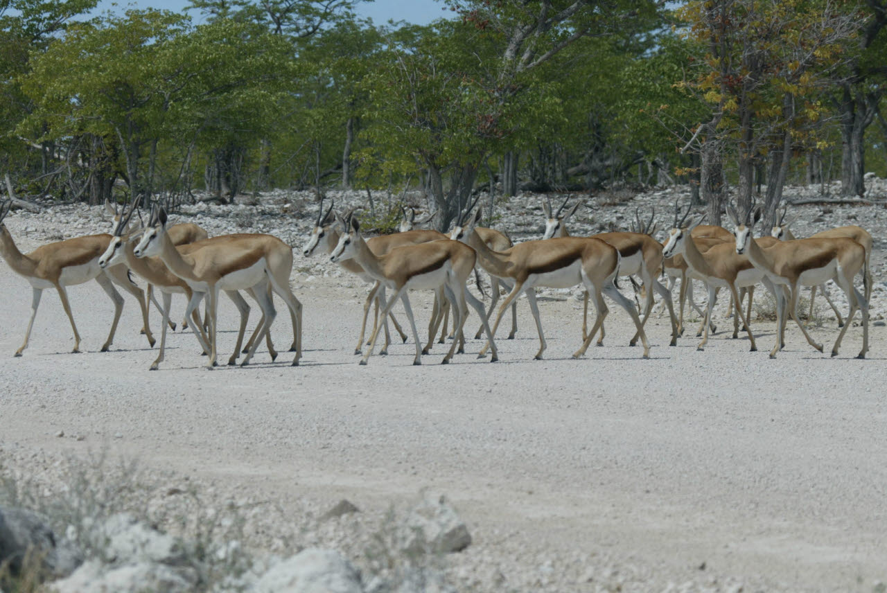 The Springbok's name is derived from its "pronking" display, which is the most spectacular form of stotting (high bounding) of any antelope. This sign of excitement is elicited by various stimuli, especially predators. In a complete performance, a Springbok makes stiff-legged jumps to heights of 10 feet with its head down, back bowed, and spinal crest fully erected. Springbok number in the tens of thousands in the Etosha National Park. Springbok have strongly ridged horns; bowed out with tips hooked inward like a stethoscope.