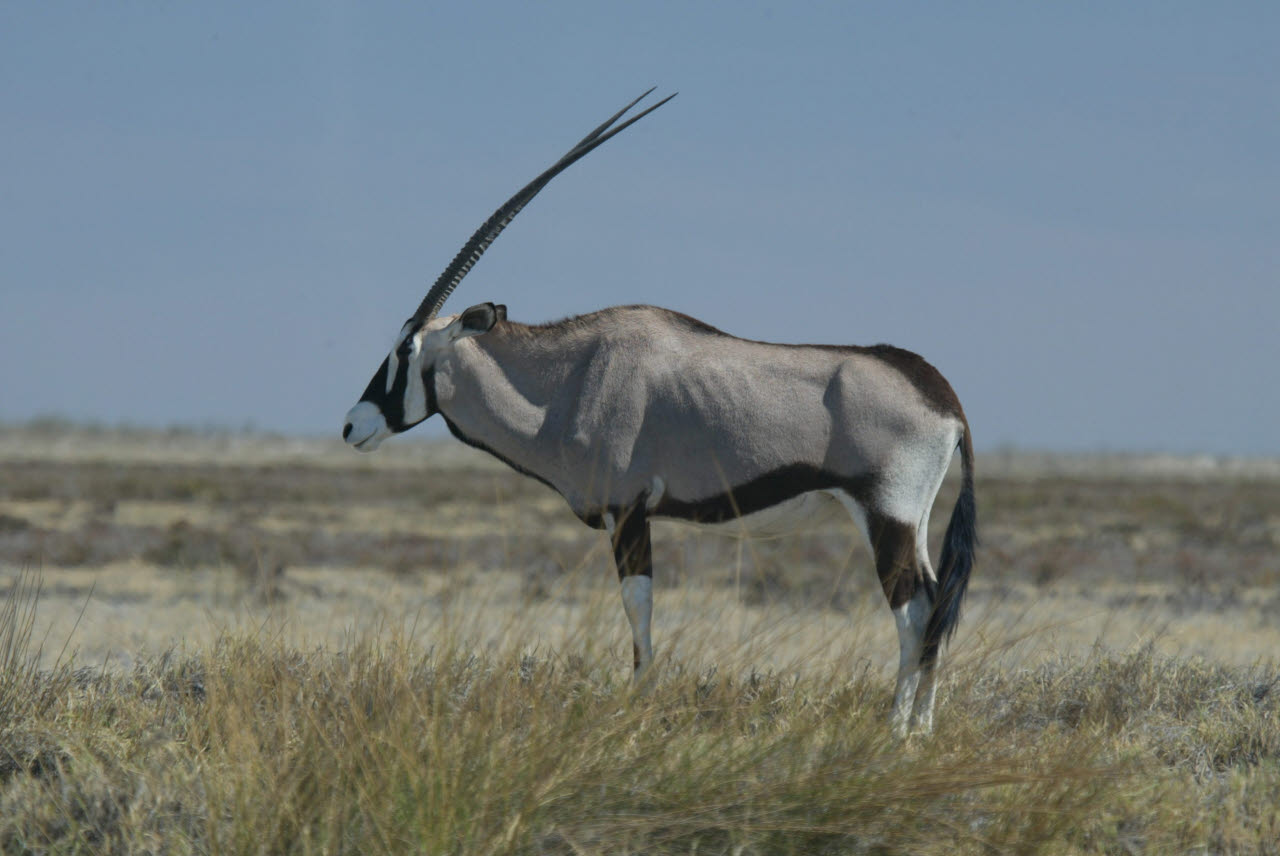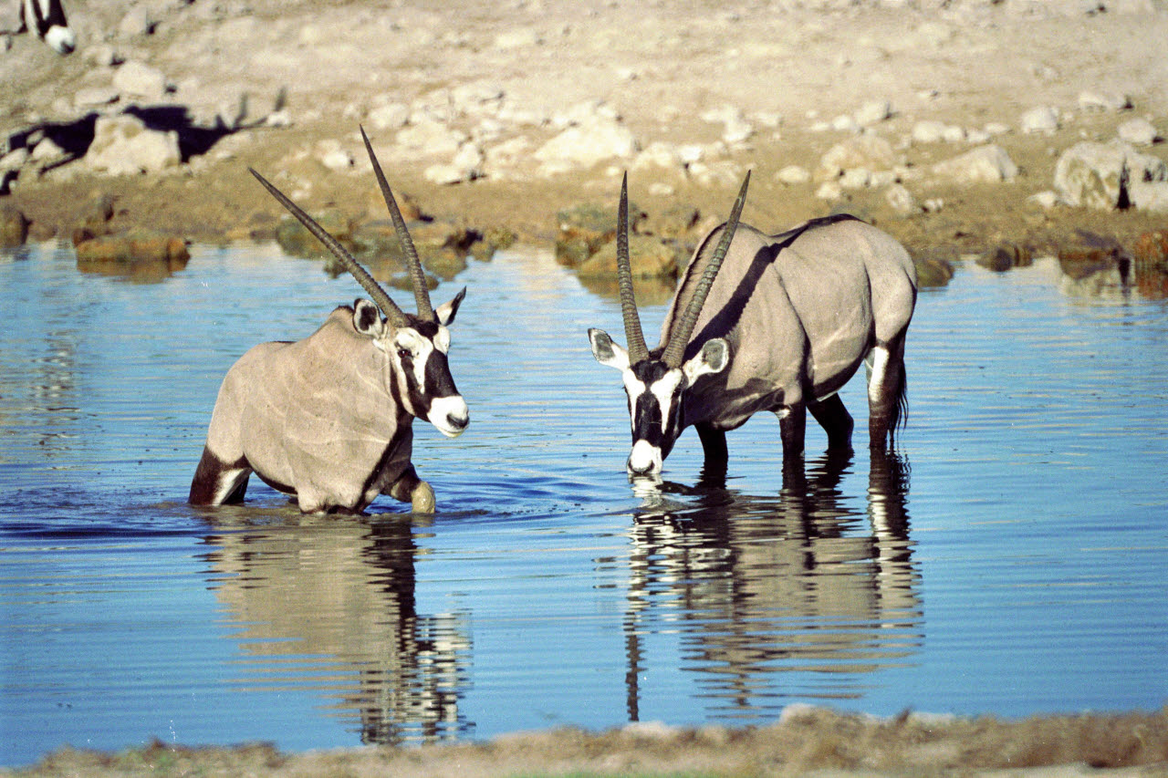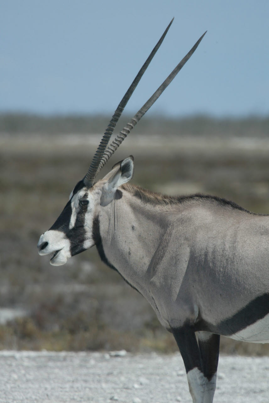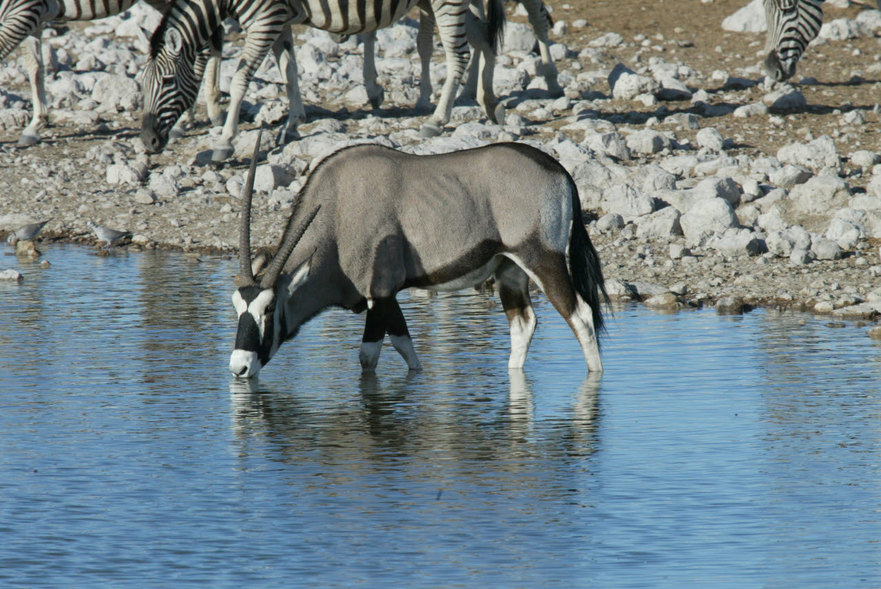 Gemsbok, or Oryx, is a large antelope with very long straight or slightly curved horns. Built rather like a polo pony: compact body with sturdy limbs; short stiff neck mane; small dewlap at jaw/throat intersection. The Oryx's ability to survive in waterless areas is second only to that of the Addax among African antelopes. It subsists on coarse desert grasses, browses to some extent, and digs up tubers, roots, and bulbs, filling it water needs with these, along with melons and wild cucumbers in the Kalahari and other sandy soils. We observed Gemsbok in nearly complete isolation wandering the Namib dessert, miles from any water source.