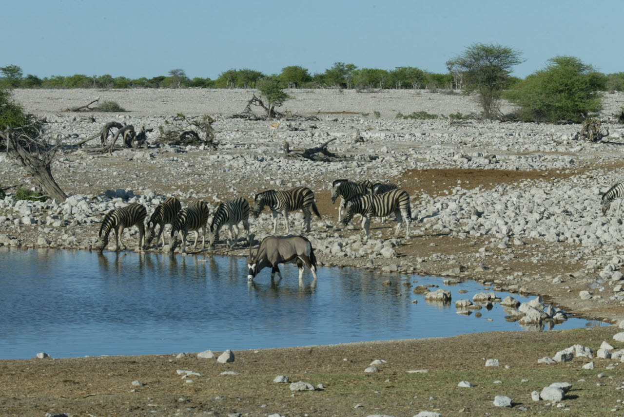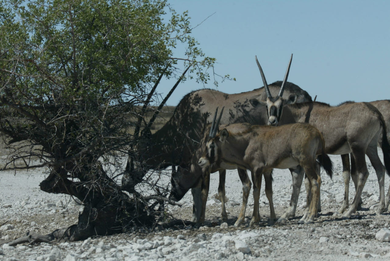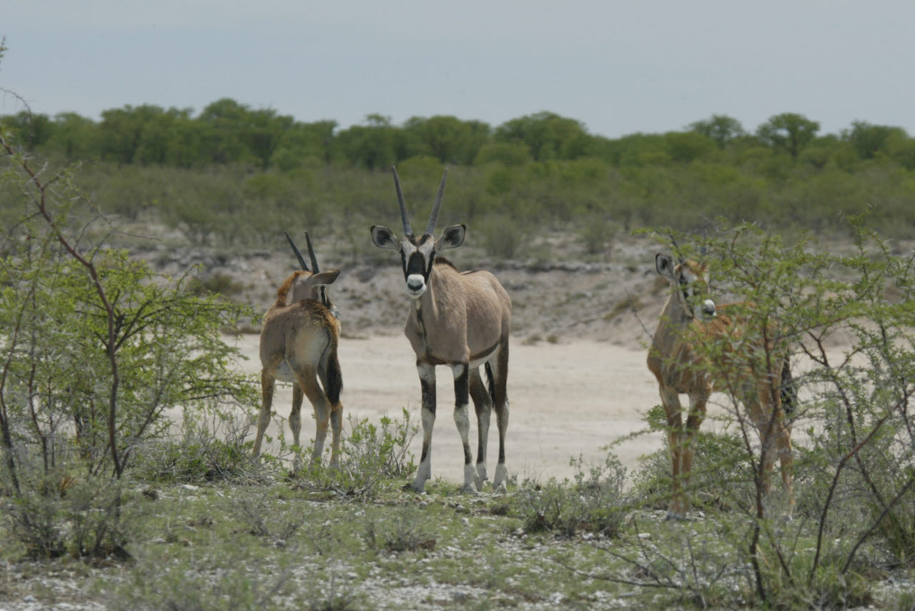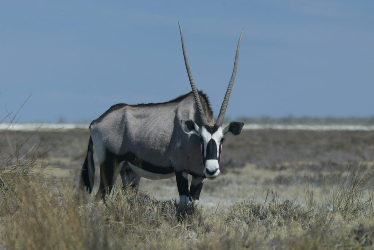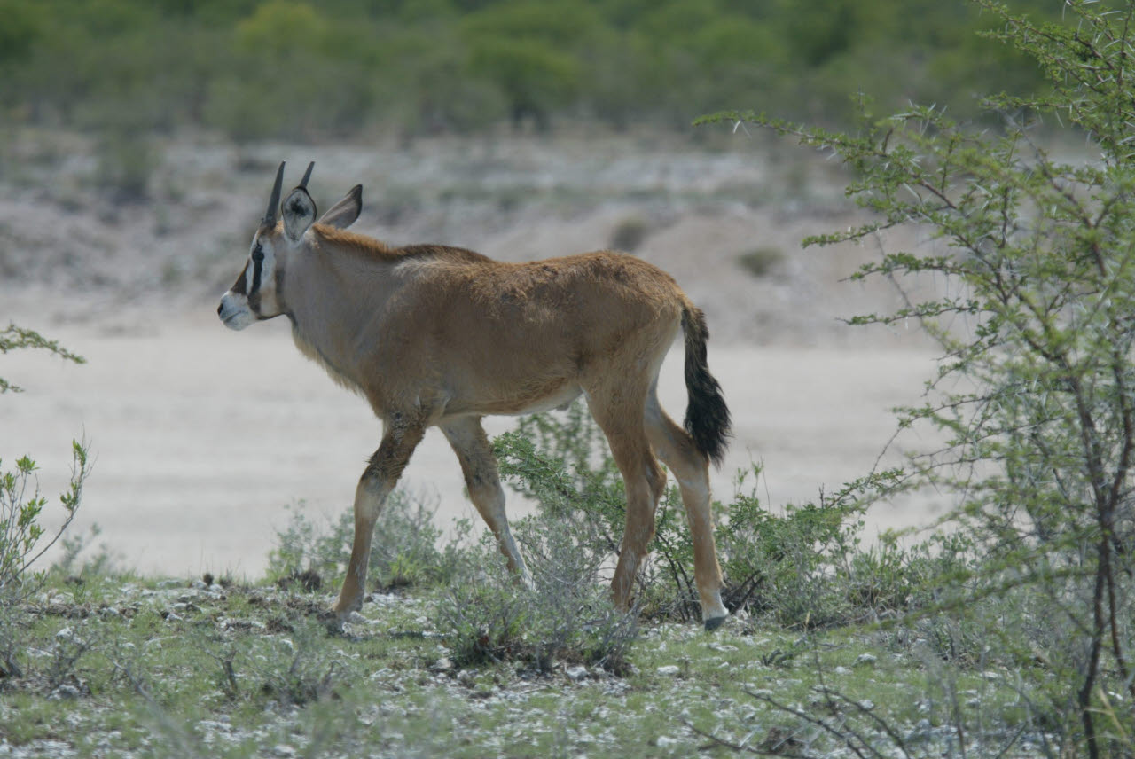 Gemsbok, or Oryx, is a large antelope with very long straight or slightly curved horns. Built rather like a polo pony: compact body with sturdy limbs; short stiff neck mane; small dewlap at jaw/throat intersection. The Oryx's ability to survive in waterless areas is second only to that of the Addax among African antelopes. It subsists on coarse desert grasses, browses to some extent, and digs up tubers, roots, and bulbs, filling it water needs with these, along with melons and wild cucumbers in the Kalahari and other sandy soils. We observed Gemsbok in nearly complete isolation wandering the Namib dessert, miles from any water source.