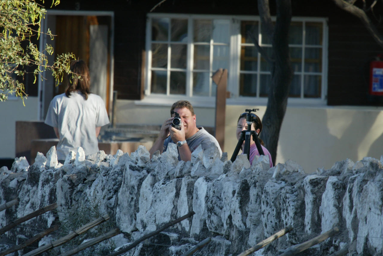 View: MedRes / HiRes | Bill films action at the waterhole. Our bungalow in Okaukuejo in the background. Fence protecting visitors from the wildlife in the foreground.