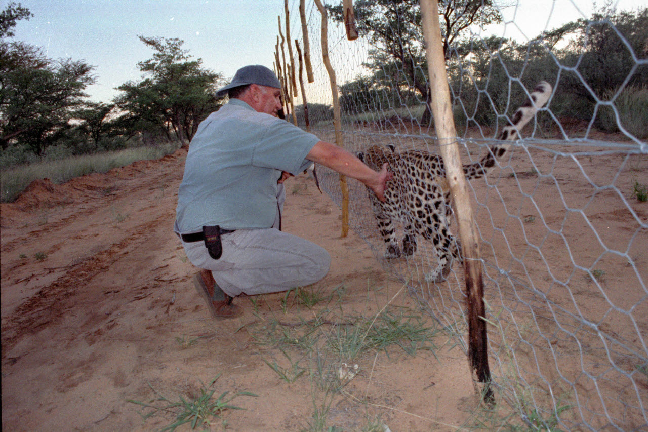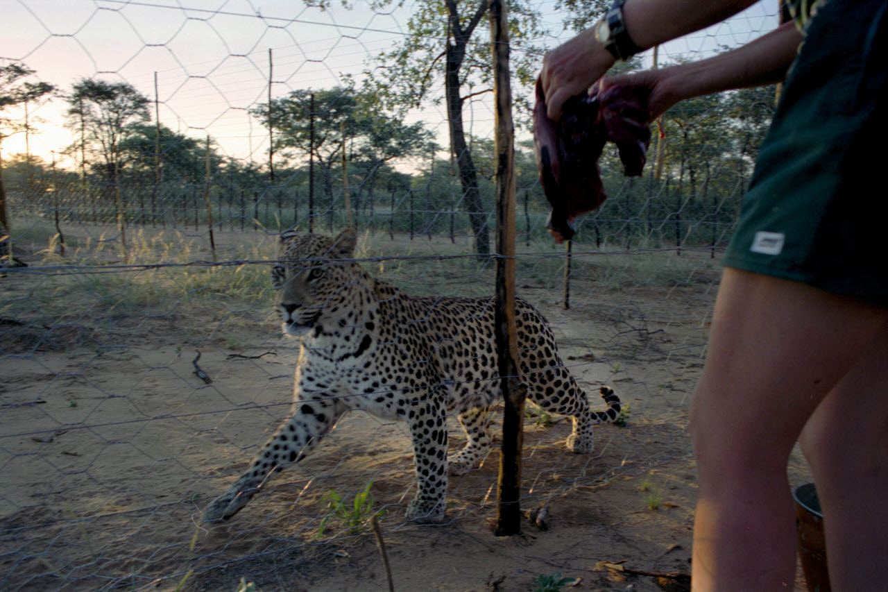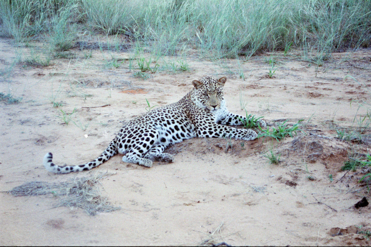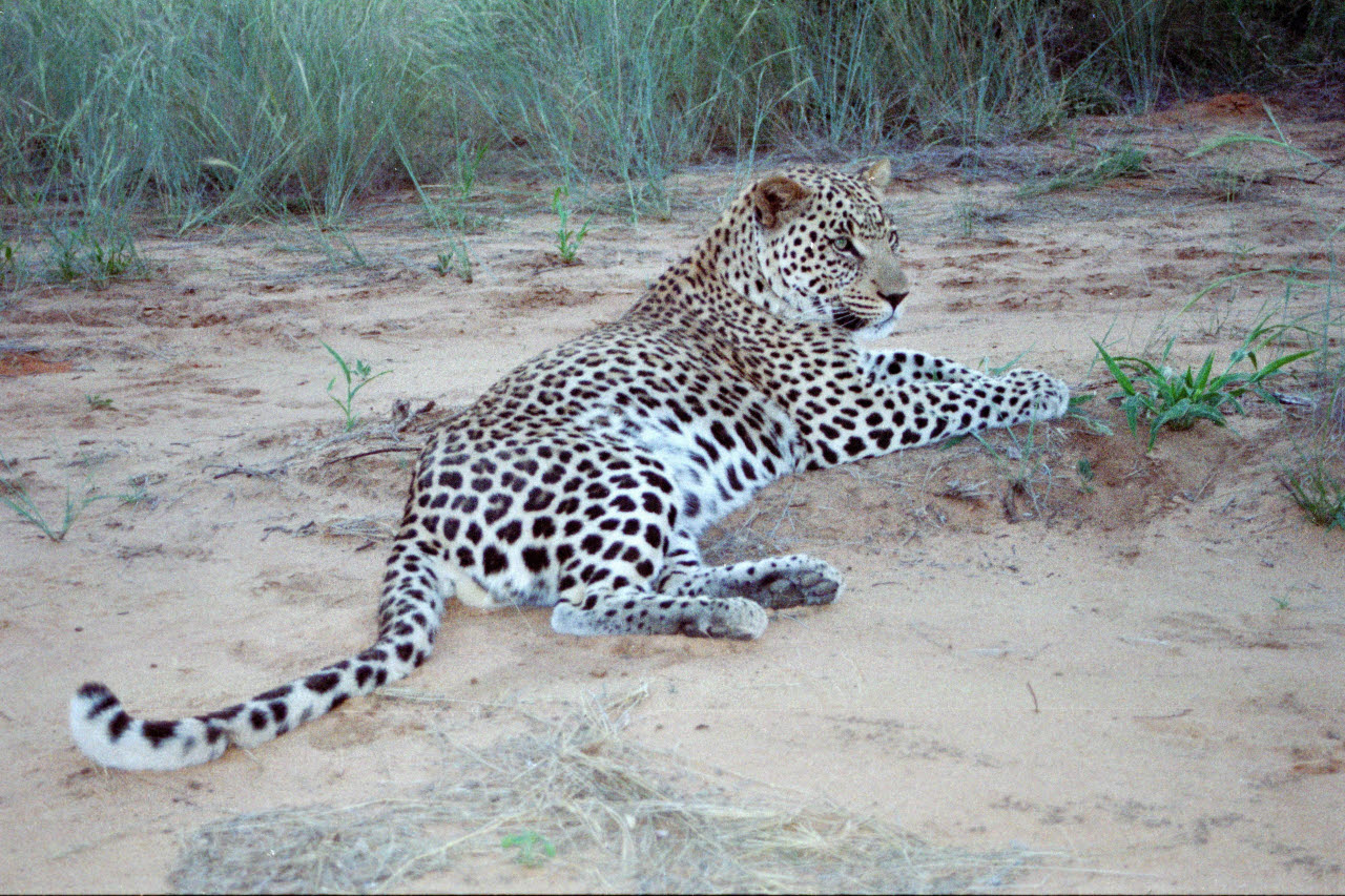 The Leopard is a large spotted cat with short powerful limbs, heavy torso, thick neck and long tail. The Leopard eats whatever form of animal protein is available, from termites to a Waterbuck. Where humans have depleted prey, the Leopard turns readily to livestock and domestic dogs. It caches kills in trees to prevent Lions and hyenas from taking its food.
