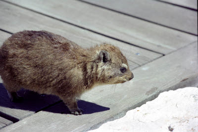 Hyraxes look like big guinea pigs and live in rock piles, cliffs, and trees. Their rubbery-soled feet are specially adapted for climbing. Hyraxes live in rocks of all kinds, from small kopjes to mountain peaks and gorges. Locations must offer vegetation, sunning places, and cavities for shelter and refuge. We have seen Rock Hyraxes, called Rock Dassies by some, atop Table Mountain in Cape Town, South Africa, and in the Kuiseb Canyon on the Tropic of Capricorn, Namibia.
