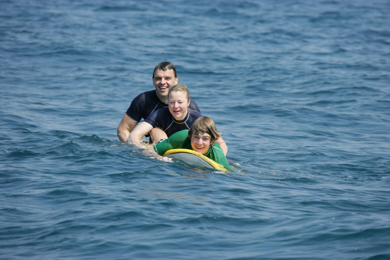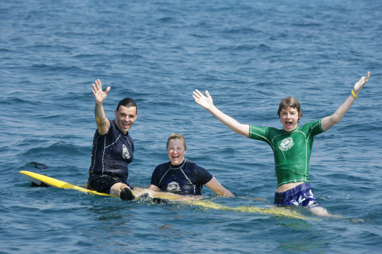 View: MedRes / HiRes | K.C., Lisa, and Alex posing on a Surfboard